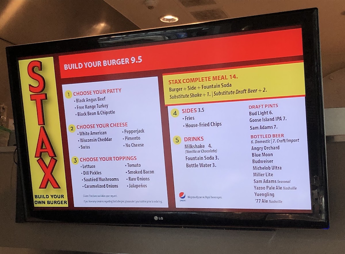 For those craving a sweet sip, indulge in a creamy milkshake available in vanilla or chocolate. Additionally, Stax offers refreshing fountain sodas and a selection of draft pints including Bud Light and Goose Island IPA.